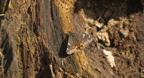 An orange underwing resting on a tree root, its bright orange hindwings peeking out frmo beneath its brown forewings