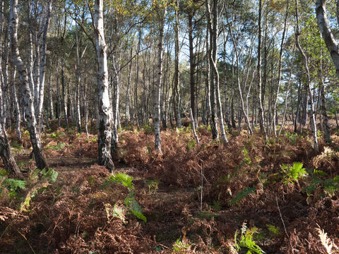 This woodland type is typically found on well-drained acid sands and gravels and is floristically quite simple. Both downy and silver birch are characteristic, and sessile oak is sometimes found in wetter areas, although pendunculate oak is more common. Sweet chestnut may be present too, as many areas were planted up in the 18th century. Holly and rowan usually form a shrub layer, but may also grow taller to fill gaps in the canopy. Underfoot, bracken is dominant, sometimes interspersed with more heathy vegetation.