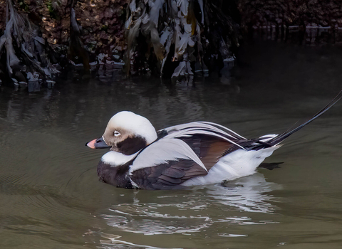 Long-tailed ducks look very different throughout the year. Adult males can always be recognised by their incredibly long, black tail. In autumn, males are largely white, with grey and black on the body and wings. They have a mostly white head, with a dark smudge on the cheek, and a dark beak with a pink band across it. Over winter they develop more patterning on the face, with a grey-brown patch surrounding the eye. In summer, the breast and face become black, but they still have a grey-brown patch around the eye. They also develop rich brown feathers on the back.Females are brown and white. They have a much shorter tail than males and no pink patch on their blue-grey beak. In autumn and winter they have a white head with a dark cap and cheek patch. In summer, the dark markings become more extensive, covering most of the head.