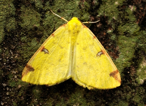 The brimstone moth is a yellow, night-flying moth with distinctive brown-and-white spots on its angular forewings. It frequently visits gardens, but also likes woods, scrub and grasslands.
