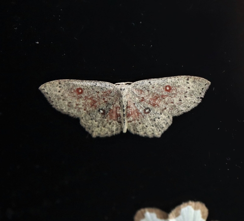 A dingy mocha moth against a dark background. It's a brown moth with dark speckling, blushes of red and four white spots with darker borders