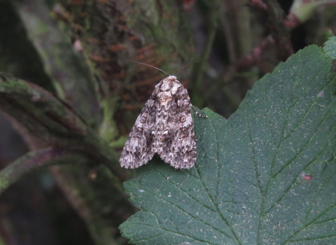 The moths are mottled grey, with a grainy texture. They're quite variable and can look very similar to several other species. They usually have a small, curved white mark on the rear edge of the forewing (the side closest to the body when at rest), which helps identify them.