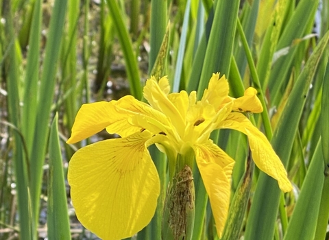 The water-loving yellow iris can be found along the margins of waterways and ponds, and in wet woodlands, fens and saltmarshes. Often mingled among other reedbed plants, its large, bright yellow flowers appear between May and August; they are thought to be the inspiration for the fleur-de-lis symbol, which is used in heraldry and also by the Scouts.